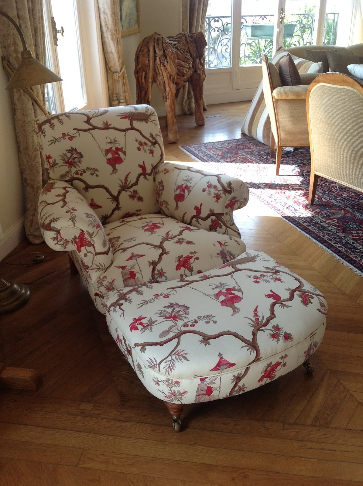 Restauration complète de ces jolis fauteuils anglais à crosse recouverts du très beau velours imprimé Persa de l’éditeur italien Luciano . Séverine a trouvé sur le bon coin un fauteuil hyper confortable bien que son.